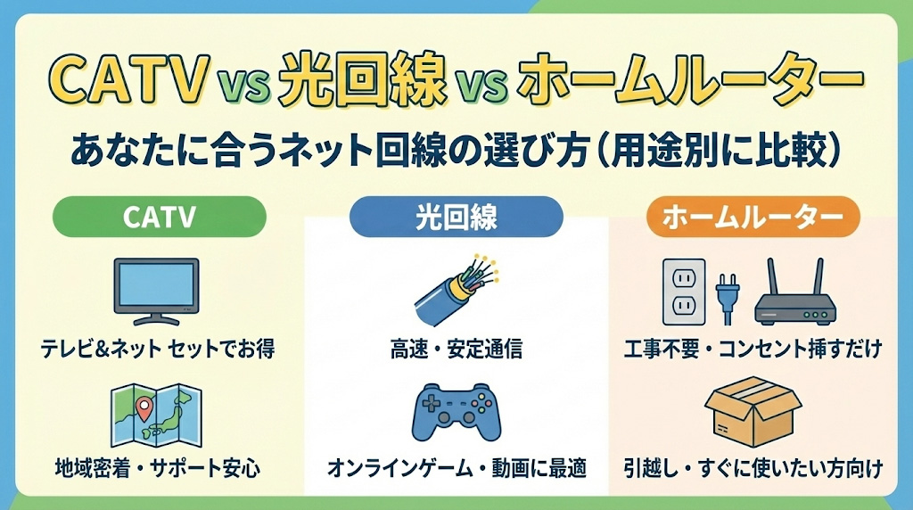 CATV vs 光回線 vs ホームルーター|あなたに合うネット回線の選び方(用途別に比較)