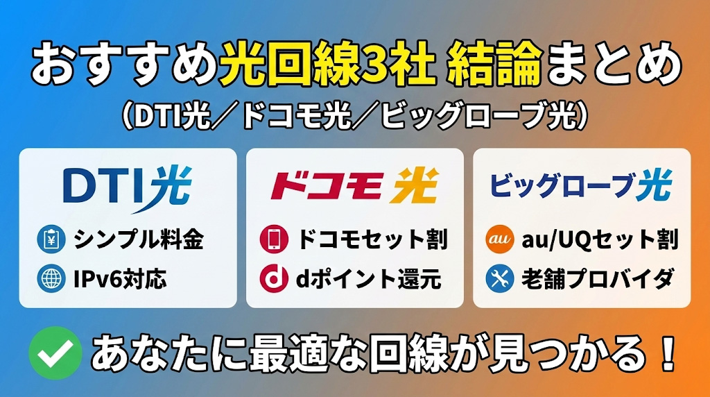おすすめ光回線3社(DTI光/ドコモ光/ビッグローブ光)結論まとめ