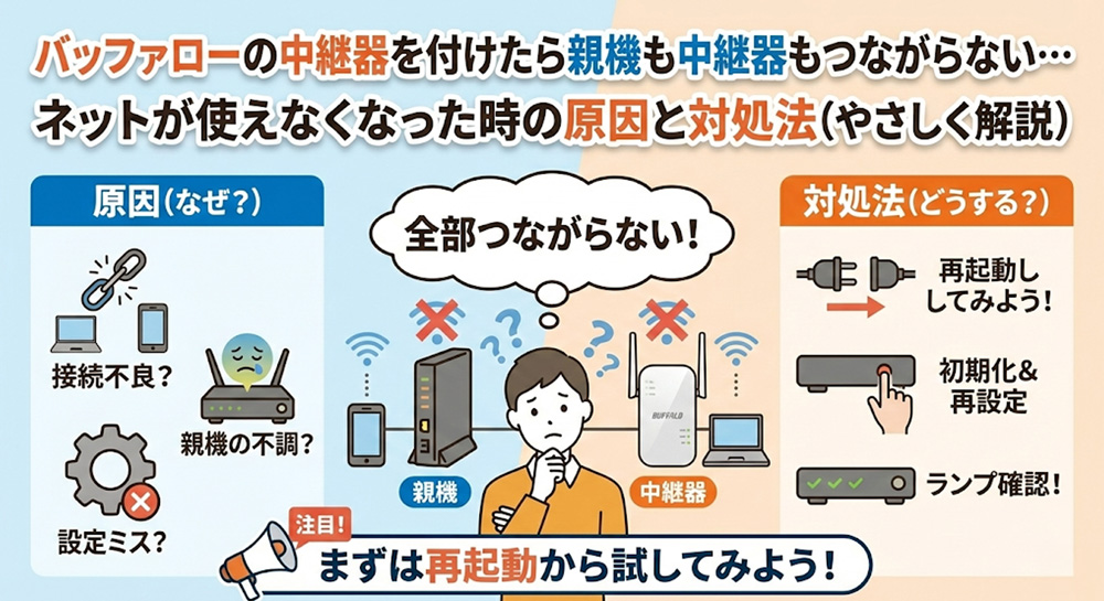 バッファローの中継器を付けたら親機も中継器もつながらない…ネットが使えなくなった時の原因と対処法(やさしく解説)